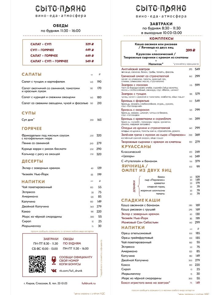 Сыто-Пряно – это необычное кафе c демократичными ценами на вино от самого простого вида до элитных образцов. Здесь можно найти как интересные российские вина, так и вина Старого и Нового Света, а также редкие наименования из Греции, Сербии и Уругвая, произведенные из знаковых автохтонных сортов.