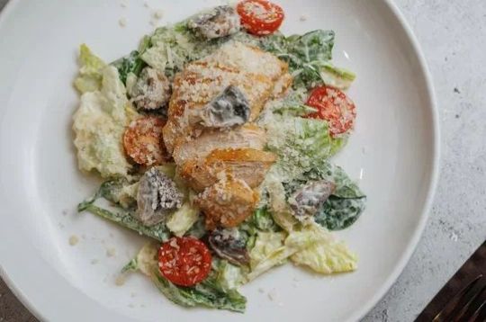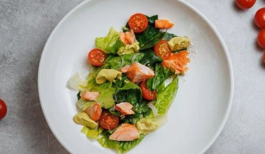 Тунец, салат с рукколой и томатами, чиабатта, яйцо пашот