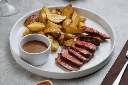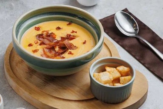 Бриошь, скрэмбл, шпинат, чипсы из бекона, соус "Галландез"