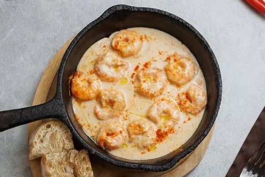 Бриошь, креветки, скрэмбл, томаты черри, руккола, медовая заправка