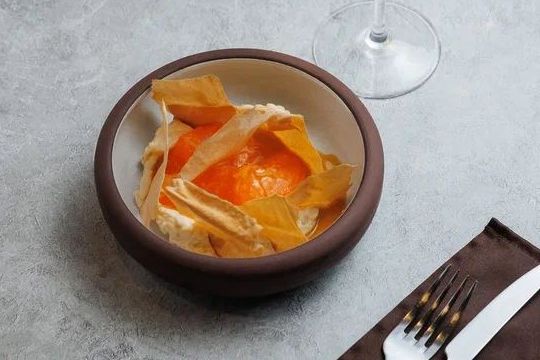 Бриошь, форель, огурец, яйцо, соус "Галландез"